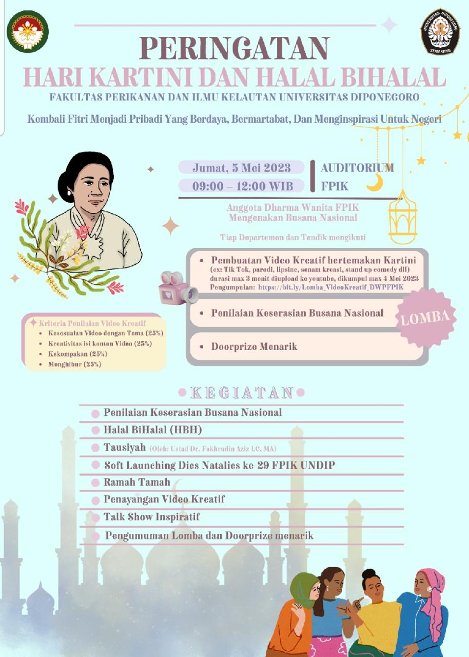 FPIK UNDIP. Jumat, 05 Mei 2023 dilaksanakan Halal Bihalal dalam rangka Hari Raya Idul Fitri 1444 H yang diusung dengan tema “Kembali Fitri, Menjadi Pribadi yang Berdaya, Bermartabat, dan Menginspirasi untuk Negeri” yang dihadiri oleh Ibu Dekan FPIK, Wakil Dekan FPIK, Tenaga Kependidikan dan Dosen. Acara halal bihalal berisi Tausiyah “Mempermudah urusan orang lain” dan doa oleh ustadz Dr. Fakhrudin Aziz LC, MA. Selain Halal Bihalal sekaligus juga dilakukan Peringatan Hari Kartini ke-58.