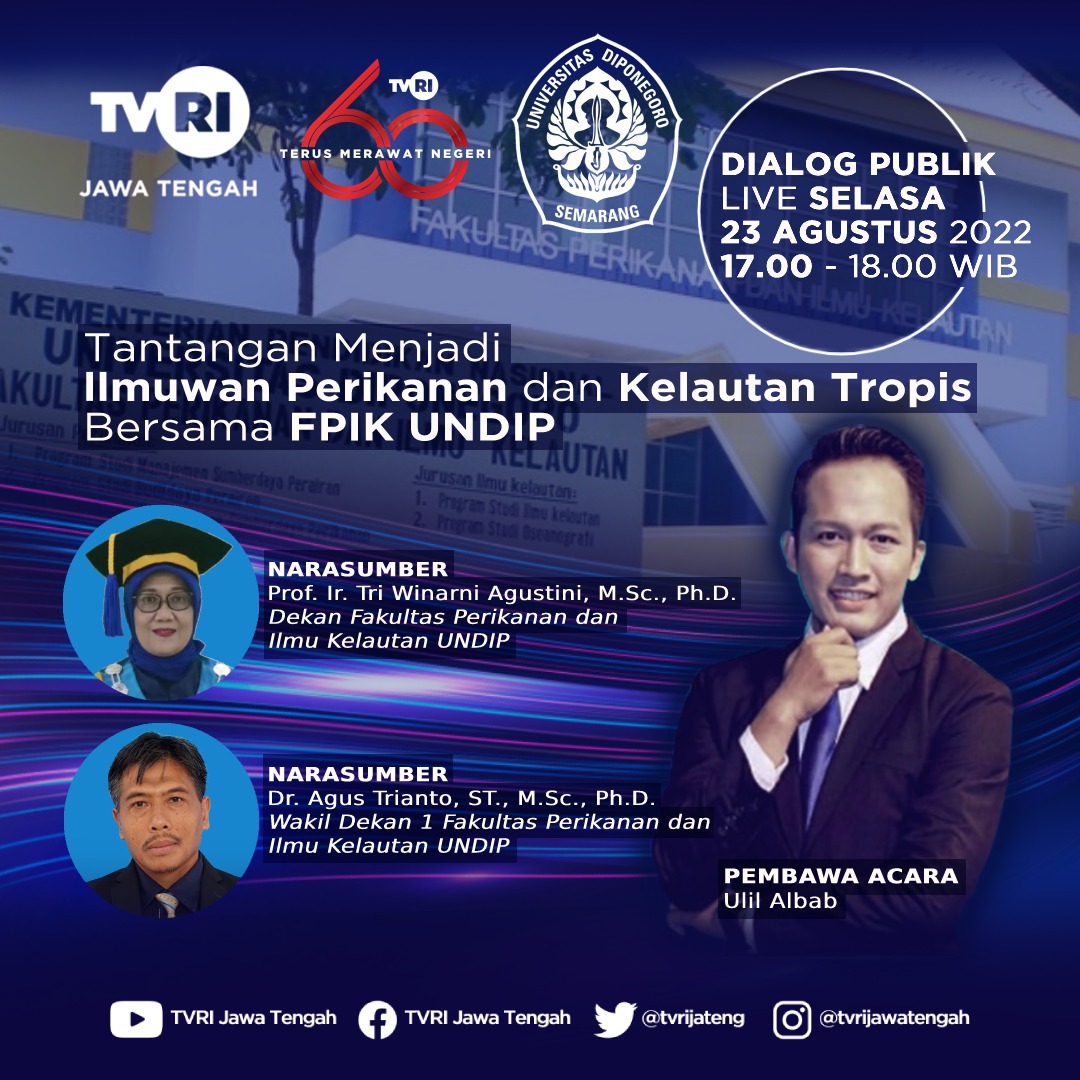 Tuesday, August 23, 2022 The Dean of the Faculty of FPIK Undip, Prof. Tri and Deputy Dean of Academic Affairs FPIK Undip Dr. Agus Trianto was a guest speaker at the public dialogue “The Challenges of Being a Tropical Marine and Fisheries Scientist” live on TVRI Central Java. Indonesia has a very large potential of marine resources, therefore it is very unfortunate if the next generation of the nation cannot manage it.