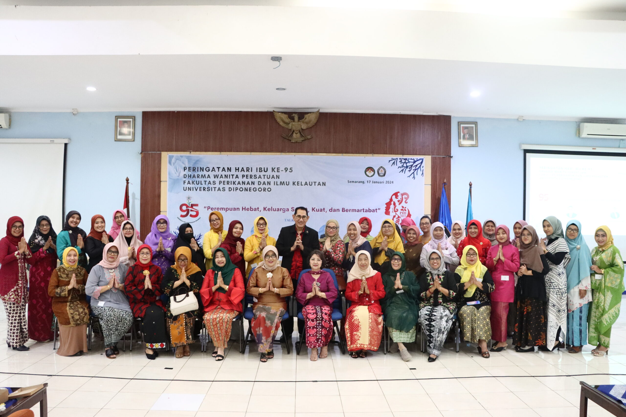 FPIK, SEMARANG – Wednesday (17/1) The 95th Mother’s Day commemoration at the Faculty of Fisheries and Marine Science (FPIK) Diponegoro University has been successfully held. Located in the Hall Building of the Faculty of Fisheries and Marine Science Undip, the event was organized by the Dharma Wanita Persatuan (DWP) FPIK Undip and attended by lecturers and female academic staff of FPIK Undip, as well as several invited guests. Carrying the theme “Perempuan Hebat, Keluarga Sehat, Kuat, dan Bermartabat ” this event aims to celebrate the important role of women in families and society.
